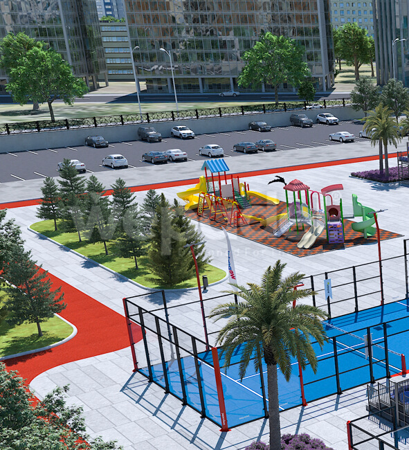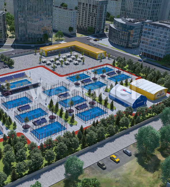 Origin Discover Padel Court is covered with 10x20 meters of green artificial turf and surrounded by steel construction, glass panels, and steel mesh. It is mostly used outdoors.